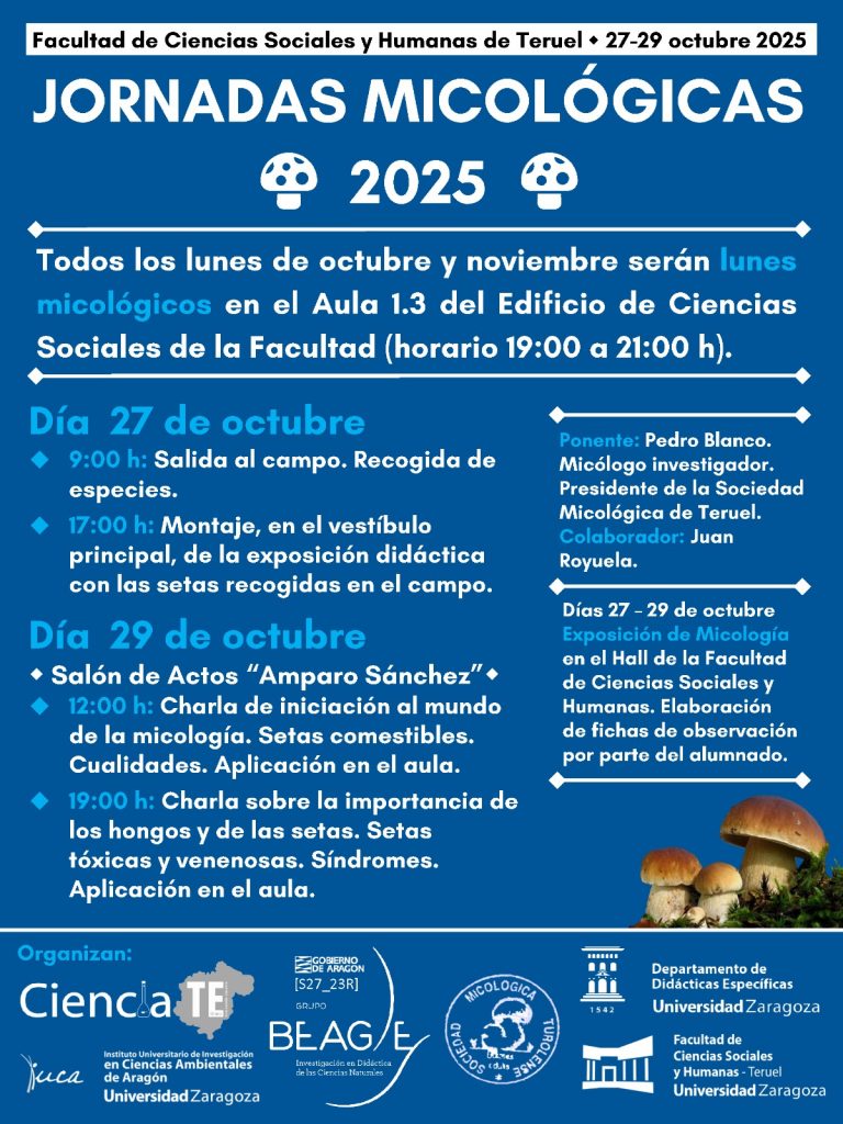 (Zaragoza. Lunes, 5 de noviembre de 2025). Los pasados días 27 y 28 de octubre se celebró la 36º edición de las Jornadas Micológicas en la Facultad de Ciencias Sociales y Humanas de Teruel. Investigadores del grupo de innovación docente CienciaTE del Departamento de Didácticas Específicas de la Universidad de Zaragoza (https://cienciate.unizar.es), pertenecientes al Grupo Beagle de investigación (proyecto S27_23R patrocinado por el Gobierno de Aragón) y el Instituto Universitario de Investigación en Ciencias Ambientales de Aragón (IUCA), en colaboración con la Sociedad Micológica Turolense.